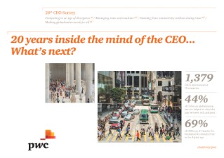 PwC’s Annual Global CEO Survey, aims to inform and stimulate the debate on how businesses are facing today’s challenges. Over the 20 years, thousands of CEOs around the world have taken the time to share their views with us. See more on PwC Global CEO Survey website.