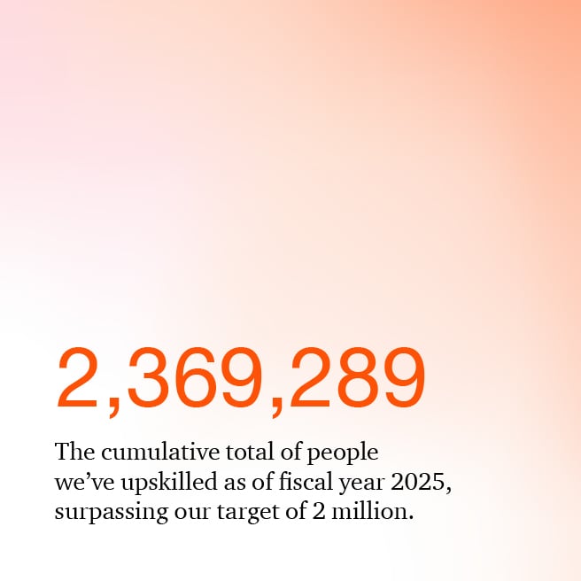 Creating an inclusive economy requires us to equip people with the skills they need for the jobs of today— and tomorrow. Everyone should be able to live, learn, work and participate in the digital world. Through our New world. New skills. initiative, we’re helping close the digital divide. By collaborating with other businesses, governments and local communities, we’re upskilling 2 million people, preparing them for the future of work. We’re further supporting our philanthropic and community investments by: