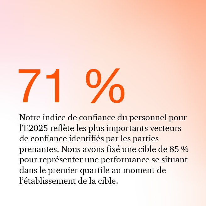 Notre feuille de route Objectif confiance souligne pourquoi et comment nos actions et nos comportements quotidiens favorisent notre engagement en matière de bonne gouvernance. Elle nous permet d’amorcer rapidement une conversation franche et directe avec nos parties prenantes, même si c’est difficile. Notre feuille de route présente également nos informations liées à la durabilité, et illustre notre processus décisionnel et les mesures que nous prenons. Par ailleurs, elle démontre qu’en matière de pratiques commerciales, les attentes de la société évoluent, d’où la nécessité de continuer à adapter nos services.