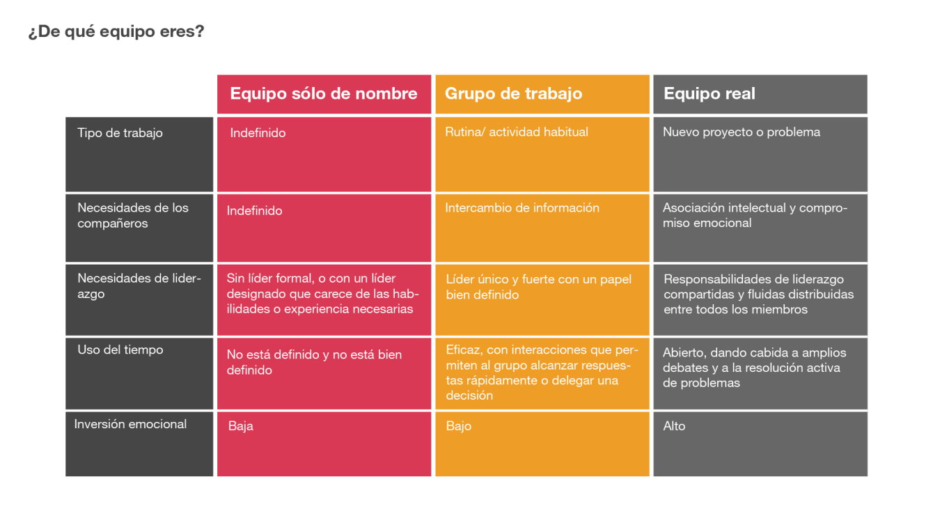 Los equipos no existen simplemente porque alguien ponga unos nombres en unas casillas en un organigrama y asigne un líder. Todo lo contrario. Los equipos existen por razones específicas y tienen estructuras de apoyo específicas. Nuestro colega Jon Katzenbach define un verdadero equipo como un pequeño grupo de personas con habilidades complementarias que están comprometidas con un propósito compartido, que tienen éxito o fracasan juntas, y que se responsabilizan mutuamente.