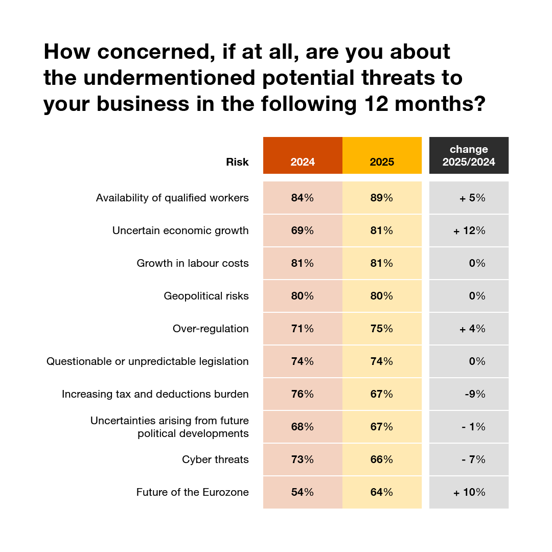 Over-regulation and questionable or unpredictable legislation top the threat ranking, with three out of four CEOs concerned about these. These are interlinked areas, with a huge amount of European legislation being thrown at us, making Europe uncompetitive. This is not just in relation to the US, where we can expect a wave of deregulation and the removal of barriers to business after Trump’s inauguration. The Czech Parliament, bogged down by obstruction, is not keeping up with EU legislation and is passing key laws right on deadline. Examples include the abolition of the super gross wage five years ago or this year’s sweeping amendment to the VAT law, which the president signed on 18 December. To implement changes over Christmas, that’s not really much time for the businesses.