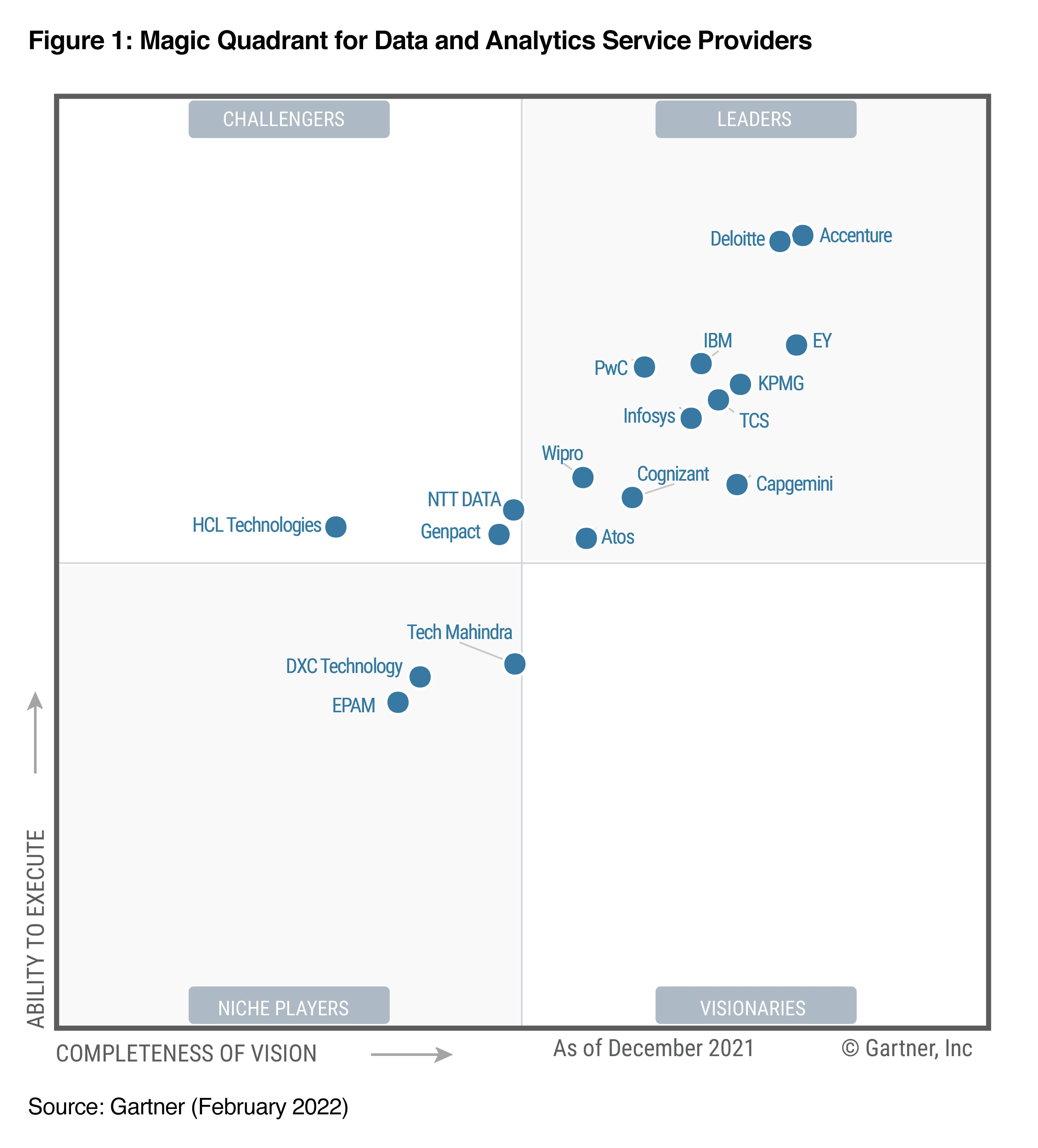 Per Gartner, "Data and analytics leaders need help to reengineer data-driven decision making. This Magic Quadrant and associated Critical Capabilities support them with the evaluation of 18 external providers of consulting, system integration and managed services."