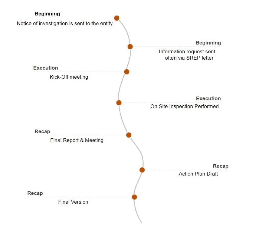 After this data has been delivered, a formal kick off meeting is held, which marks the start of the inspection or investigation. Attending are the members of the supervisory team, the responsible entity teams including members of the management body and, optionally, members of the JST. The size and scope of the exercise is explained, while the entity usually gives a presentation on its structure, business model and strategy.