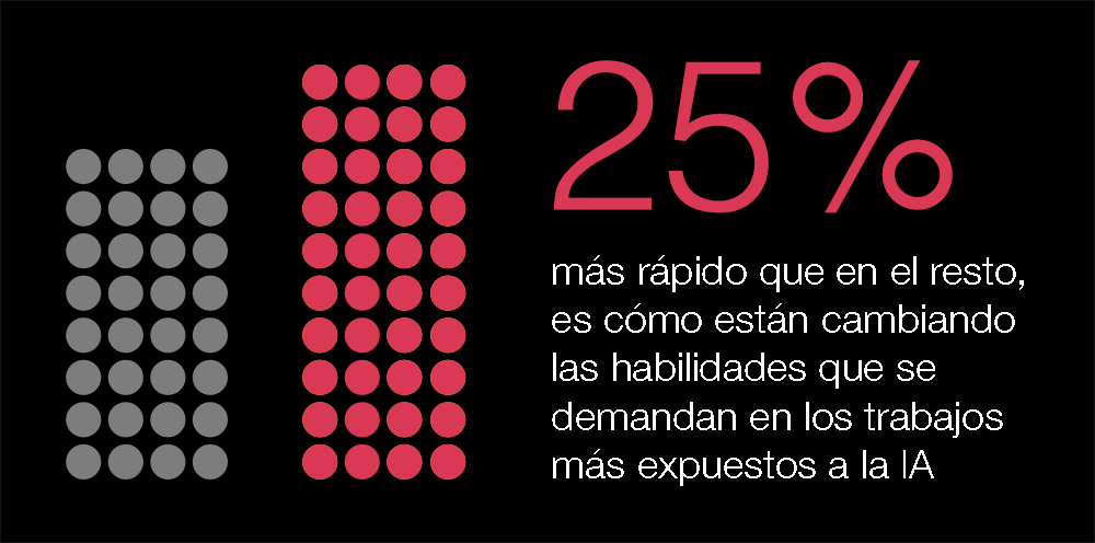 ¿Qué significa esto para un trabajador, por ejemplo, un típico analista financiero? Implica que deberá adaptarse a un mercado laboral cambiante. Las habilidades requeridas por los empleadores en ocupaciones expuestas a la IA están cambiando rápidamente. Las antiguas habilidades están desapareciendo de los anuncios de empleo, y están apareciendo nuevas, un 25% más rápido en estos roles que en los menos expuestos a la IA.