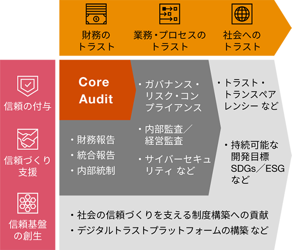 財務諸表や統合報告に対する監査業務を中心に、クライアントの社会における信頼作りを支援しています。社会の変化とともに、情報への「信頼」の重要性が高まっており、期待されるサービス内容も広がりを見せています。この期待に応えていくことが、私たちPwC Japan監査法人の使命です。ここで得られる知見は、会計士に必要なスキルの基礎となり、今後のキャリア形成にも生かされます。