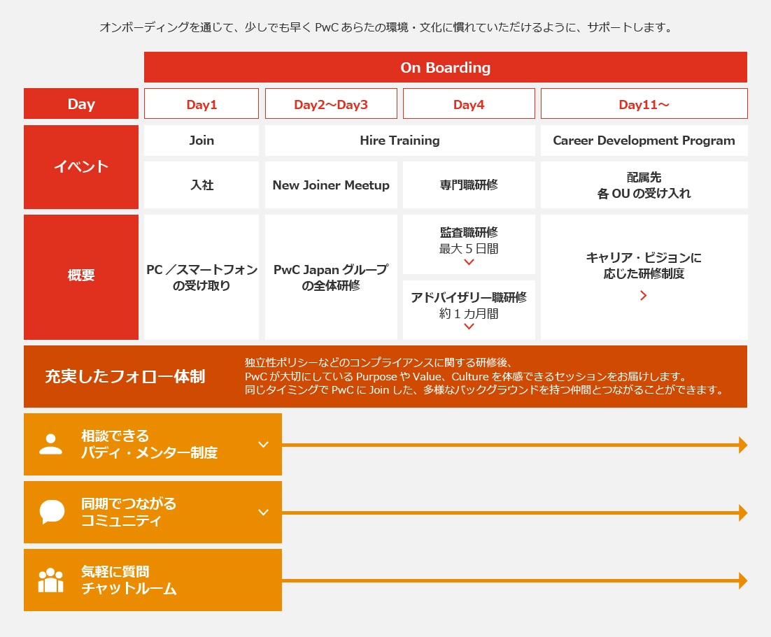 マインドセットやロジカルシンキング、ファシリテーションなどのコアスキルを学ぶ研修に加え、PwCのカルチャーや方法論、デジタル活用を理解するための研修、チームでクライアントの課題解決を議論する実践的なケース研修など、PwCで活躍するために必要なマインド・スキル・リレーションを習得できる内容です。