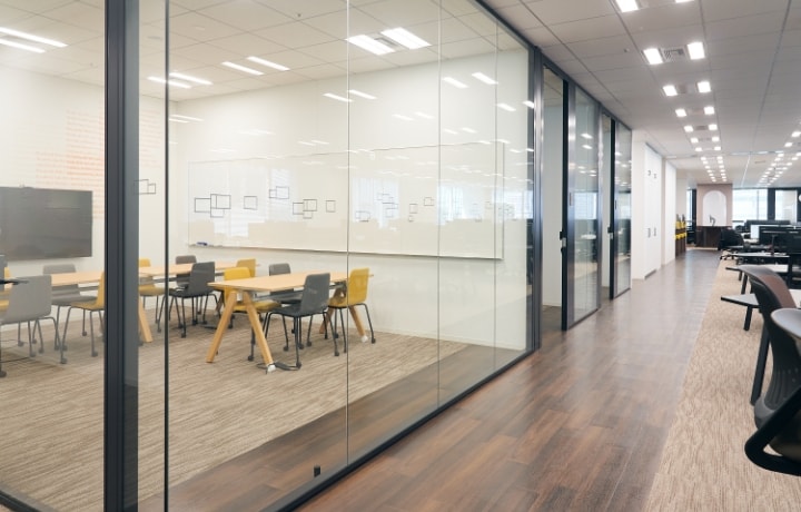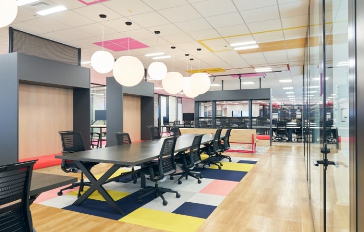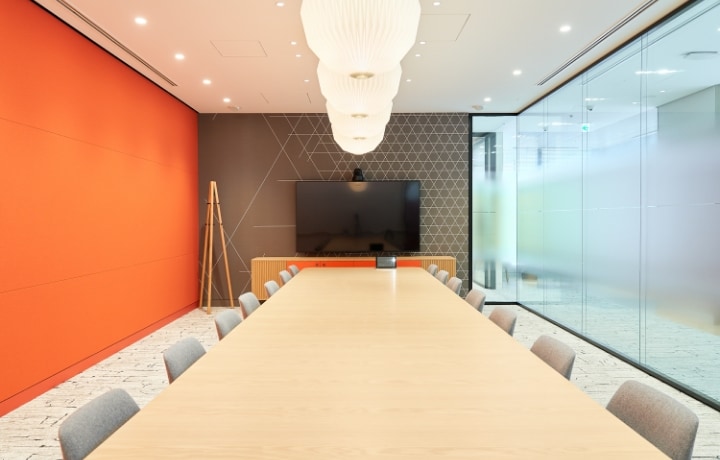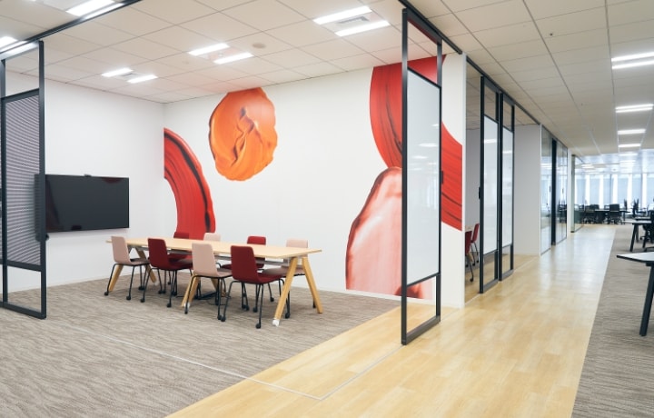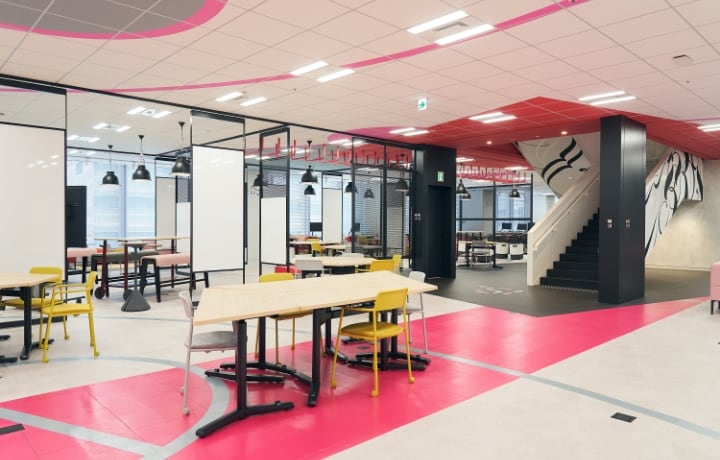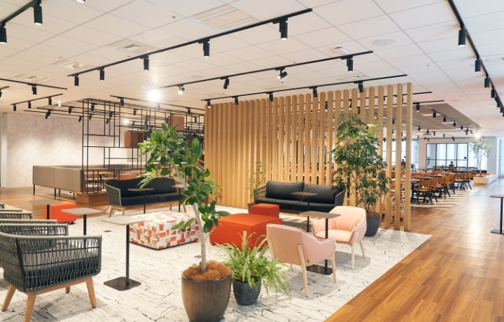 新しいワークスタイルを推進するPwC税理士法人。東京・大手町のオフィスはその象徴です。オフィスのテーマは「共創」。場所に縛られない働き方を可能にするとともに、スタッフ間のコラボレーションを積極的に促す仕組みも導入されています。例えばオフィスの各エリアの混雑状況をリアルタイムに確認することが可能なため“密”を回避できる一方、自分が直接コミュニケーションを取りたいスタッフの執務場所も確認することができます。また、各フロアを内階段でつないだことでスタッフの何気ない出会いや偶発的なコミュニケーションも促進されます。一人ひとりの働き方の自律的な選択を可能にする、これからの時代にふさわしいオフィスです。