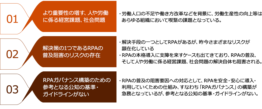 人的リソースの不足や長時間労働といった問題は、いまや社会問題と化しています。これらの課題に対する有力なソリューションのひとつがRPAですが、セキュリティ事故や思ったような効果が上がらないなど、RPAの導入をめぐって多くのリスクが顕在化しつつあります。このままではRPAの普及が阻害され、結果として、人や労働に係る社会問題がいつまでも解決されないことが危惧されます。