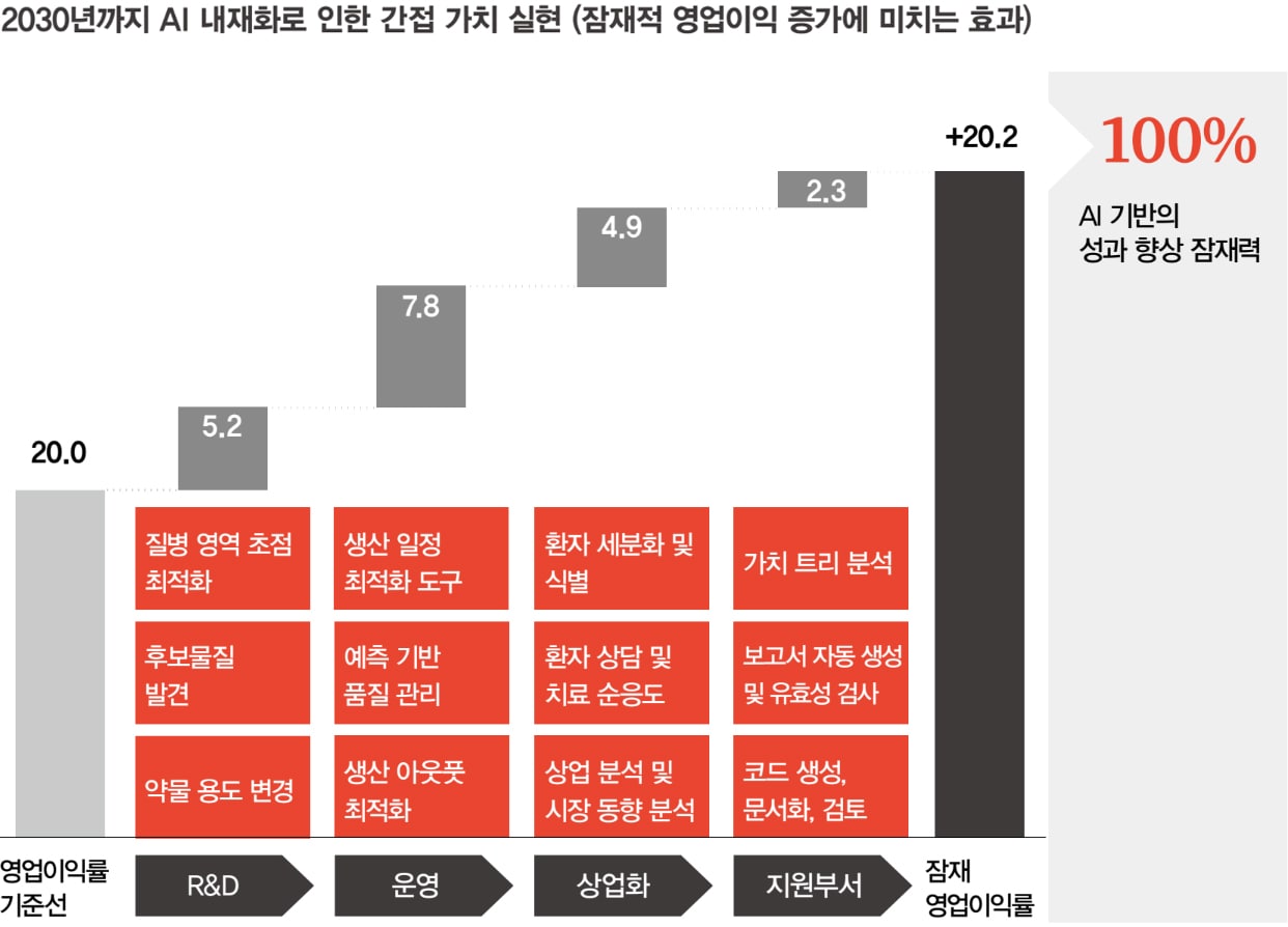 미래의 제약 헬스케어 산업은 예방과 치료의 경계가 점점 더 모호해지면서 개인화·디지털화될 것으로 예상된다. 인공지능(AI)은 제약, 보다 넓은 의미로 헬스케어, 테크와 소비재 간의 융합을 가속화하고, 각각의 분야에 큰 혜택을 생성하고 있다. 제약기업은 새로운 제품과 서비스에 AI를 직접 접목시키거나, AI를 사용하여 프로세스를 보다 생산적이고 효율적으로 개선함으로써 간접적인 이익을 얻을 수 있다.