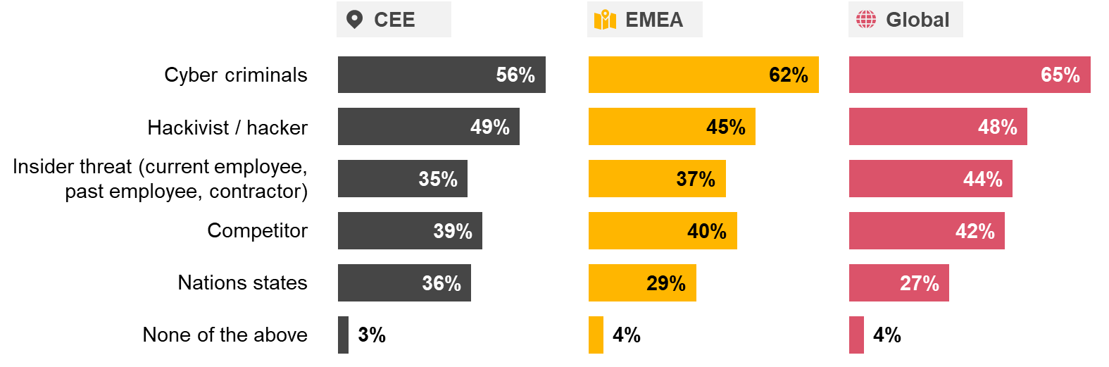 Topping the 2023 list of rising organisational threats in CEE are cybercriminal activity (56%) and hacktivist/hacker (49%) for threat actors; and email (44%), users (38%), endpoints (35%), mobile, cloud, web applications (each 31%) and third-parties (30%) for pathways by which adversaries can gain access.