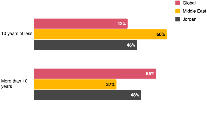 More than half (54%) of Jordan’s CEOs say that in the past five years, their company has begun competing in new sectors or industries, and 43% report that more than 20% of their revenue has come from this diversification. Industrials and services, technology, media and telecommunications, consumer markets, and financial services are the most popular new sectors for Jordanian companies to explore.