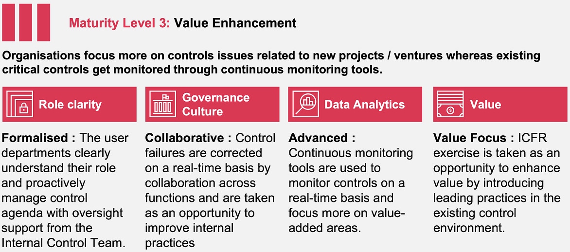 All these initiatives form part of an organisation’s journey from traditional cost-based financial reporting to value-focused ICFR. Before embarking on the journey, it is critical for organisations to assess their level of maturity (see illustration below) in order to extract maximum value from their investment in ICFR. The level of value depends on various factors, including the organisation’s size, operations, accounting framework, internal control systems, governance and overall culture.