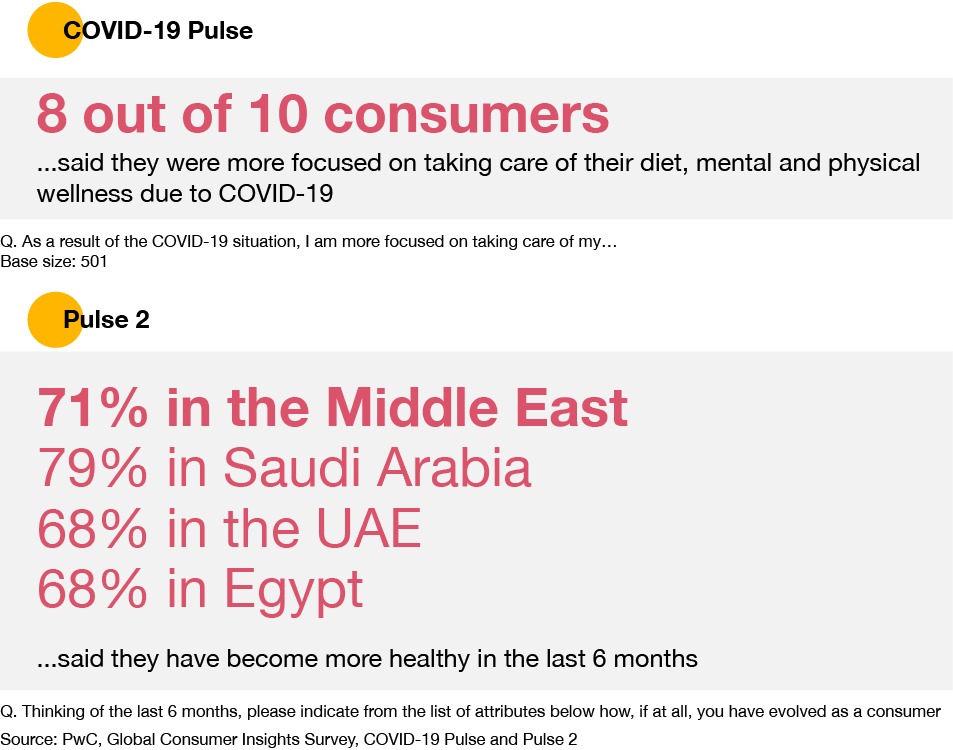 As with their counterparts globally, the health crisis has dramatically increased awareness of health and wellness among Middle East consumers. In the 2020 Global Consumer Insights Survey, more than half (58%) of respondents said they were making time each week to improve their health and general wellness and adopt a better diet. This rising health consciousness is reflected in our Pulse 2 results, particularly in Saudi Arabia where 79% of consumers said they have become more healthy.
