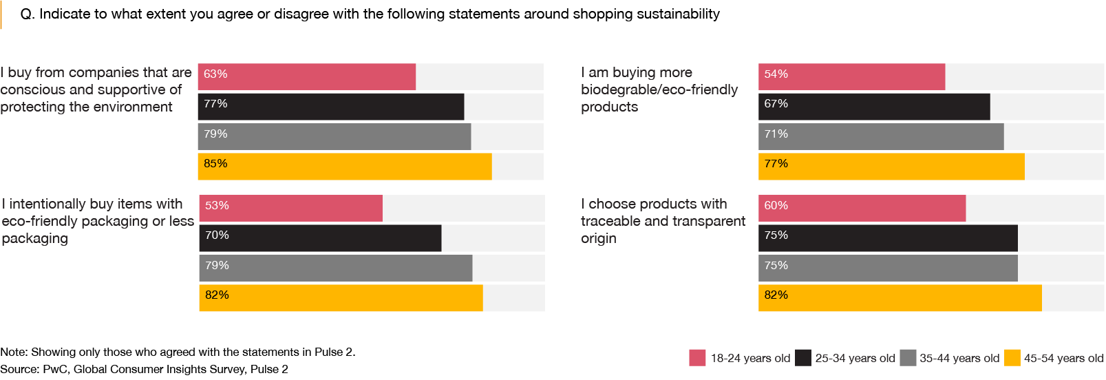 It is interesting to note that this environmental consciousness has seen an uptick from our Pulse 1 survey – at the time six out of 10 consumers agreed with our sustainability statements – and that younger, Generation Z, consumers are less likely to agree with those statements. In fact, the older the shopper the more likely they are to care about sustainability.