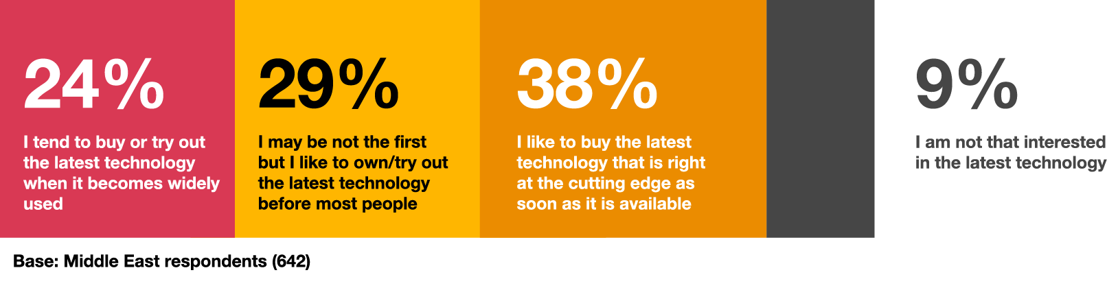 The survey has revealed that 67% of Middle Eastern consumers would like to be the first to buy cutting-edge technology as soon as it is available and to try out the latest technology before most people - a trend is significantly higher than 48% of the global respondents.