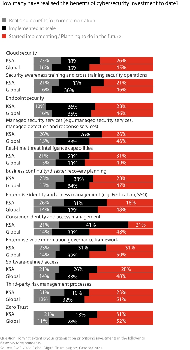 The overall cybersecurity readiness data from KSA companies does not differ greatly from the responses of global companies, and organisations everywhere report a significant challenge in maximising the return on their cybersecurity investments. For example, almost half of companies worldwide are still close to the start of the process of cybersecurity control implementation. Around a third have implemented advanced controls at scale, but less than one fifth of global companies say they have actually realised the benefits of cybersecurity implementation.