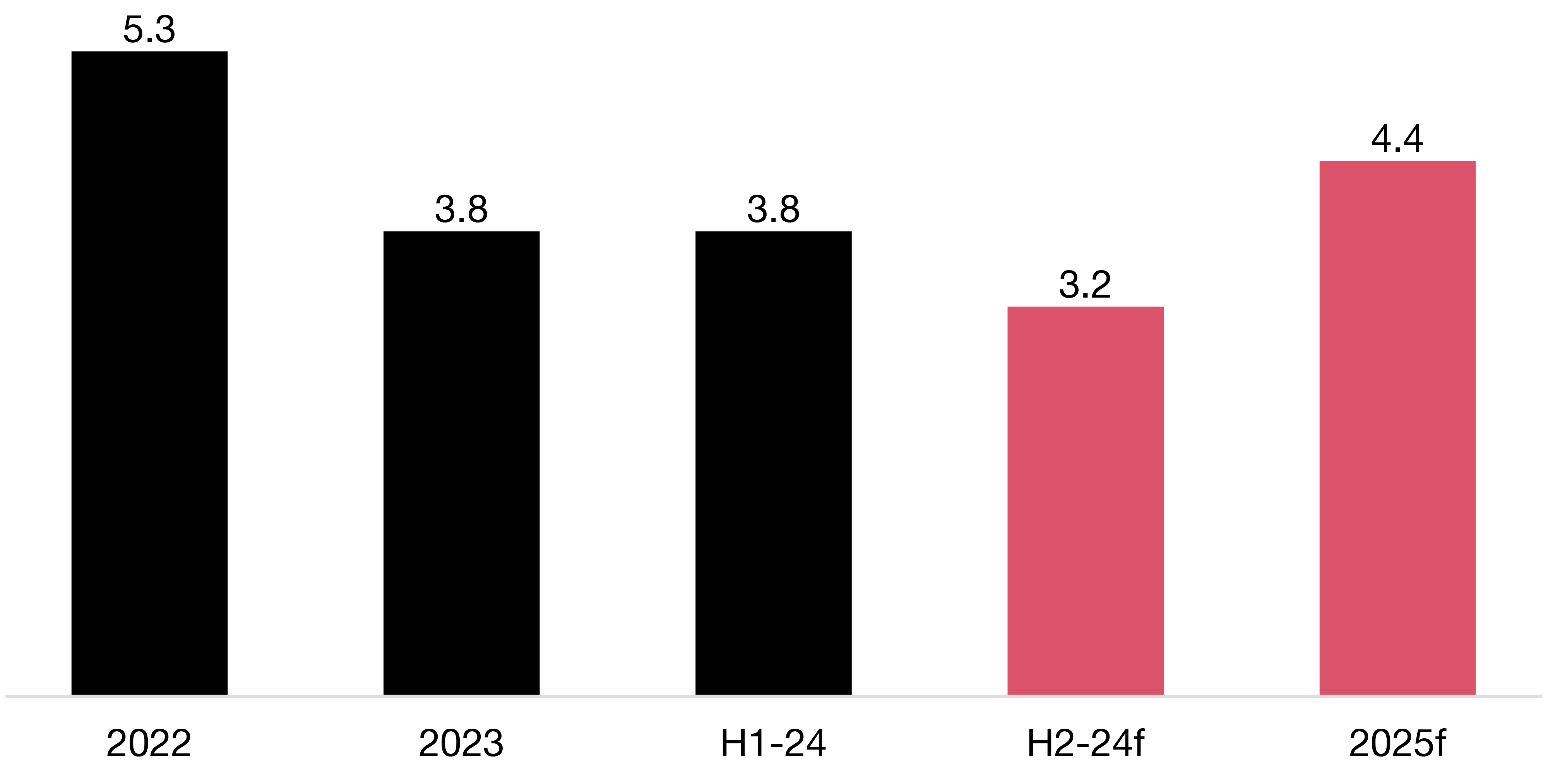 The oil sector, a key driver of the Saudi economy, remains constrained by demand and OPEC+ quotas, with production in 2024 set to average just under 9m b/d, the lowest level since 2010. The year began with a significant win for Saudi Arabia’s oil market strategy as seven other countries agreed to make a second round of voluntary cuts beyond their formal OPEC+ allocations, whereas previously Saudi Arabia had been bearing this burden alone, making a unilateral cut of 1m b/d from July 2023. Then in June, an agreement was reached to extend OPEC+ action through H2 2024 and 2025, maintaining headline quotas and gradually tapering voluntary cuts, which would bring Saudi output back to nearly 10m b/d in late 2025, the highest since June 2023. These efforts seemed to bear fruit as the oil price broadly stabilised, with Brent crude averaging $83/barrel from January to August, similar to 2023. However, concerns grew about the economic health of China and the US and hence the trajectory for oil demand growth, causing Brent to dip, which fell below $70 on 10th September for the first time since 2021. In response, Saudi Arabia and its peers postponed the taper of their voluntary cut by two months until December. Assuming the current schedule is followed, Saudi production in 2024 will be about -7% lower than in 2023 and will then rebound by 7% in 2025.