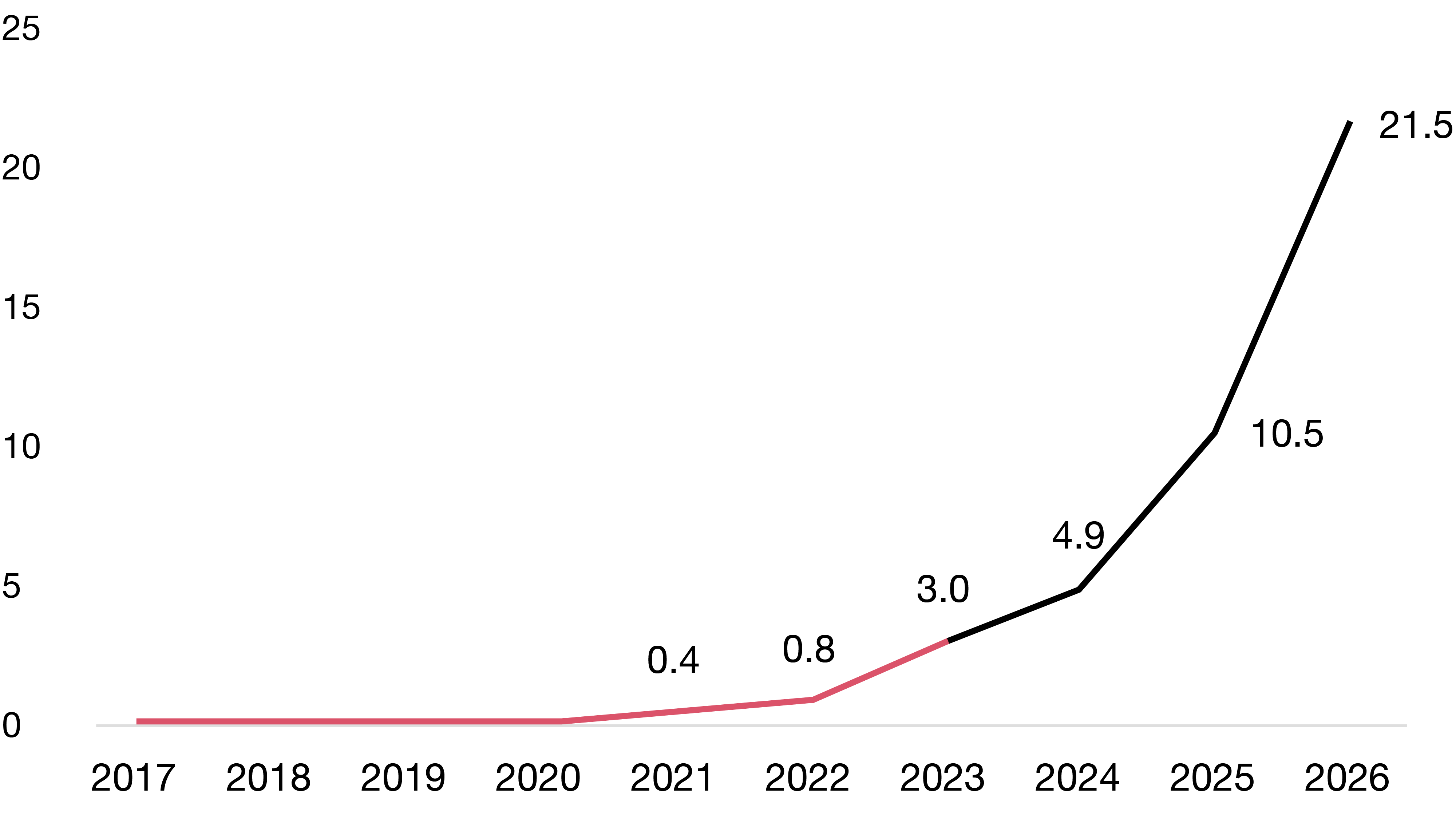 Source: IRENA historic data until 2023, PwC forecasts for 2024-26 based on announced projects