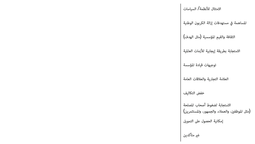 السؤال: أيّ من العوامل التالية تعتبرونها الأهم لتبني أو تطوير استراتيجية للمعايير البيئية والاجتماعية والحوكمة المؤسسية داخل مؤسستكم؟