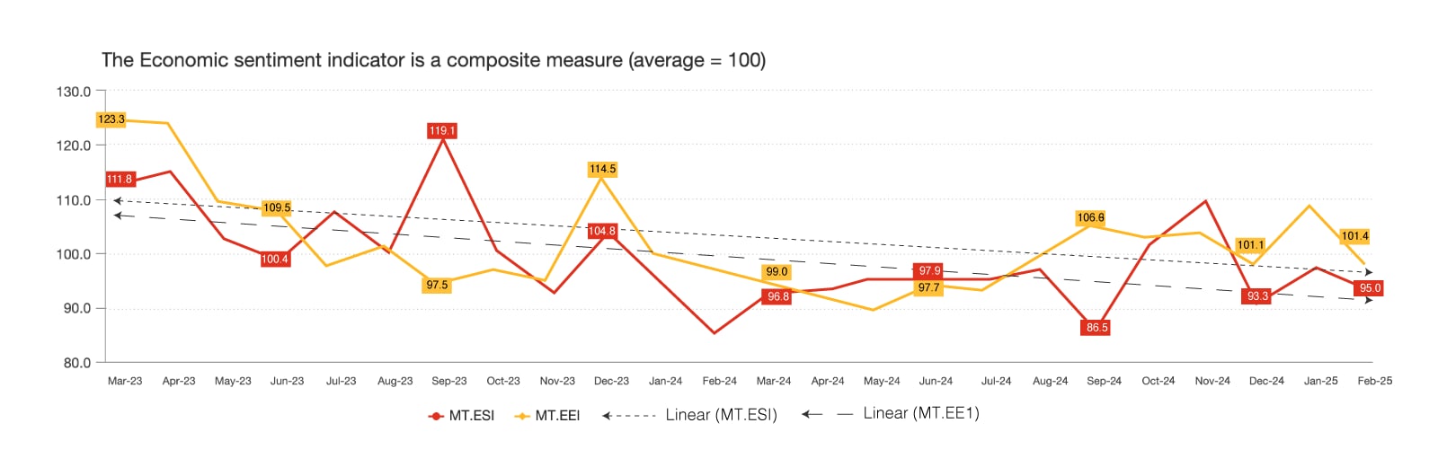 The Economic Sentiment Indicator (ESI) continued to decline in 2025, following a temporary increase from the two-year low observed in September 2024. Despite a notable rebound in November above the 100 long-term average, the downward trajectory resumed into 2025, reflecting persistent concerns over economic uncertainty and a more pessimistic outlook for early 2025. The Employment Expectation Indicator (EEI) stabilized above the 100 average at the beginning of 2025, yet overall remained on a downward trend.