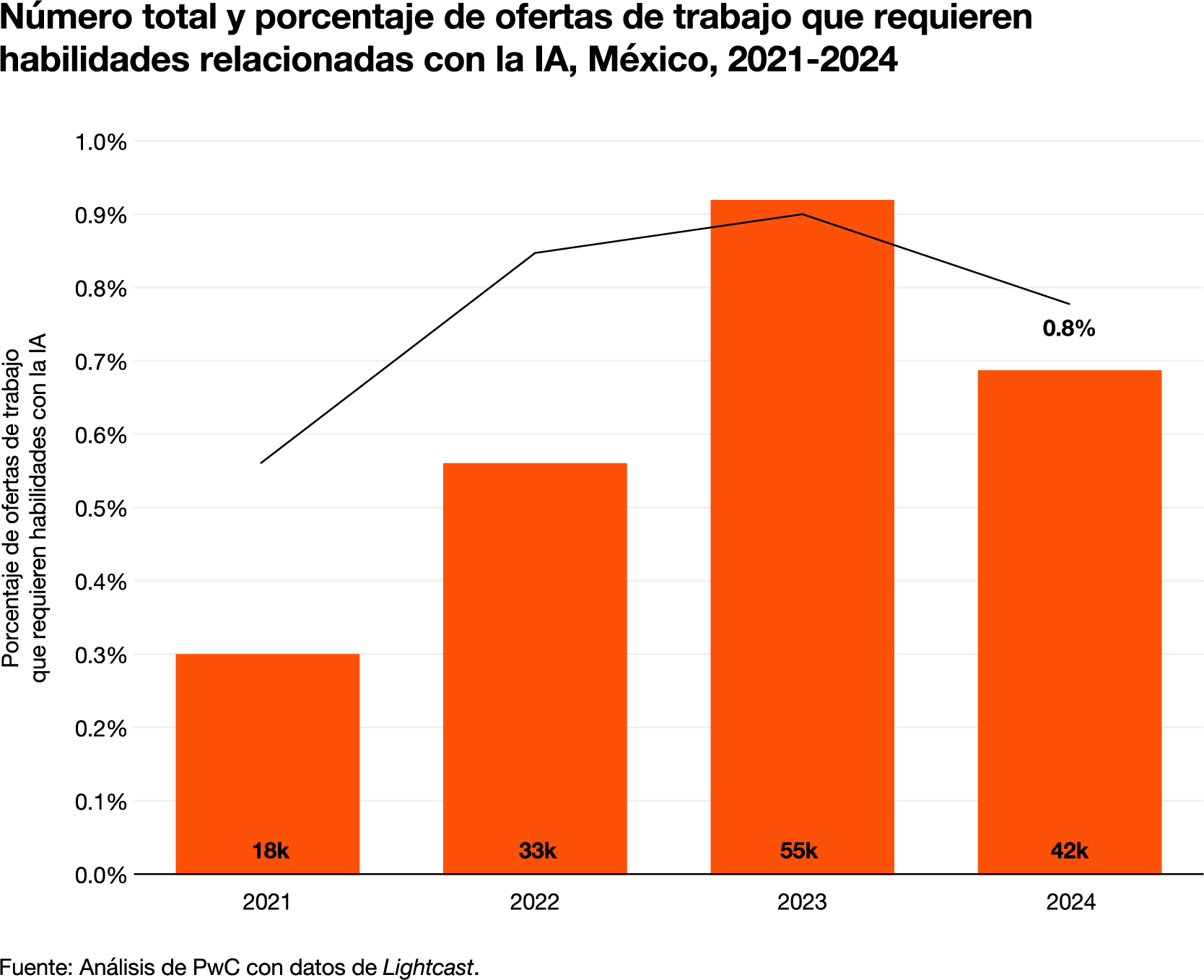 Entre 2021 y 2024, la demanda de habilidades en México relacionadas con la inteligencia artificial aumentó a una tasa de crecimiento anual compuesta (CAGR) del 33.6 por ciento. Sin embargo, en 2024 se observó una disminución atribuida a un mercado laboral menos robusto. Esto indica una desaceleración en la adopción de tecnologías relacionadas con la IA , más que un retroceso.