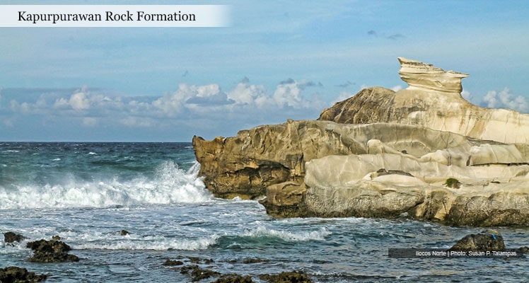 The Kapurpurawan rock formation is located on the rocky coast of Burgos, Ilocos Norte. It is known for its creamy white and streamlined limestone formations, which have been sculpted by different oceanic and weather forces. Burgos is located on the northwestern tip of Ilocos Norte.