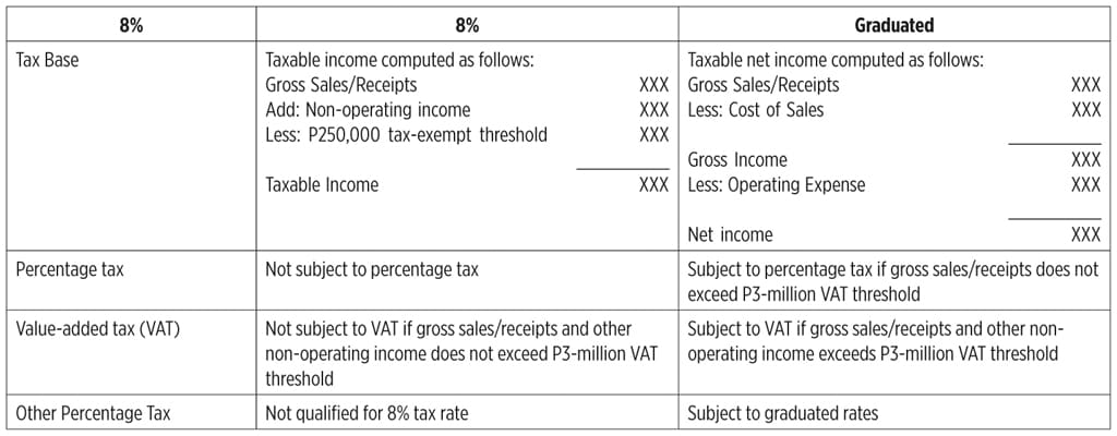 However, if the gross sales/receipts and other non-operating income exceeds the VAT threshold during the taxable year, the individual’s income tax shall be computed using the graduated income tax rates even if he initially selected the 8% income tax rate. In such case, the 8% income tax rate paid in the previous quarters shall be allowed as tax credit. Consequently, the taxpayer shall be subject to business taxes, such as percentage tax and VAT, in addition to income tax.