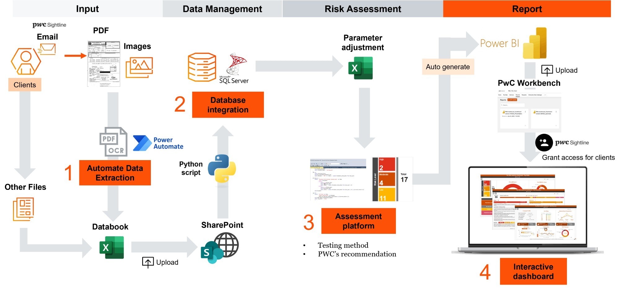 Interactive dashboard: Highlights areas needing attention and presents results interactively on a dashboard