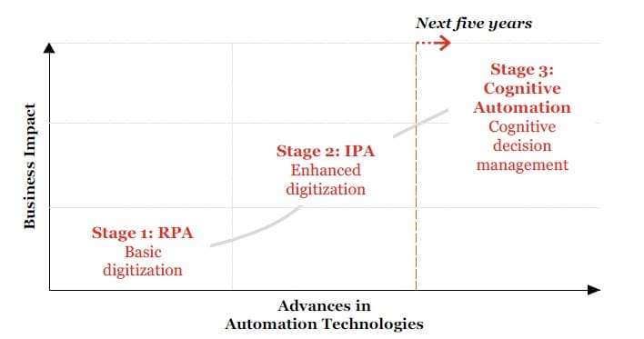ระดับที่ 1 กระบวนการทำงานแบบอัตโนมัติ (Robotic Process Automation: RPA) คือ ระบบซอฟต์แวร์อัตโนมัติที่มีความสามารถในการจัดการข้อมูลจำนวนมากและงานประเภทที่ต้องทำซ้ำๆ ซึ่งระบบ RPA ได้ถูกนำมาใช้ในการจัดทำและเปลี่ยนแปลงข้อมูลขั้นพื้นฐาน เช่น เอกสารพวกใบวางบิล ใบกำกับสินค้า รวมไปถึงกระบวนการรับ