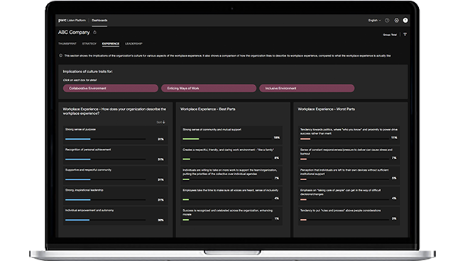 The Culture Thumbprint, a tech-enabled diagnostic service developed by the Katzenbach Center, and delivered on Listen Platform, is how PwC assesses organizational culture. It is an AI-driven survey-based tool that surfaces insights on dominant culture traits, so that leaders can identify The Critical Few behaviors that help drive cultural alignment with business outcomes and employee experience.