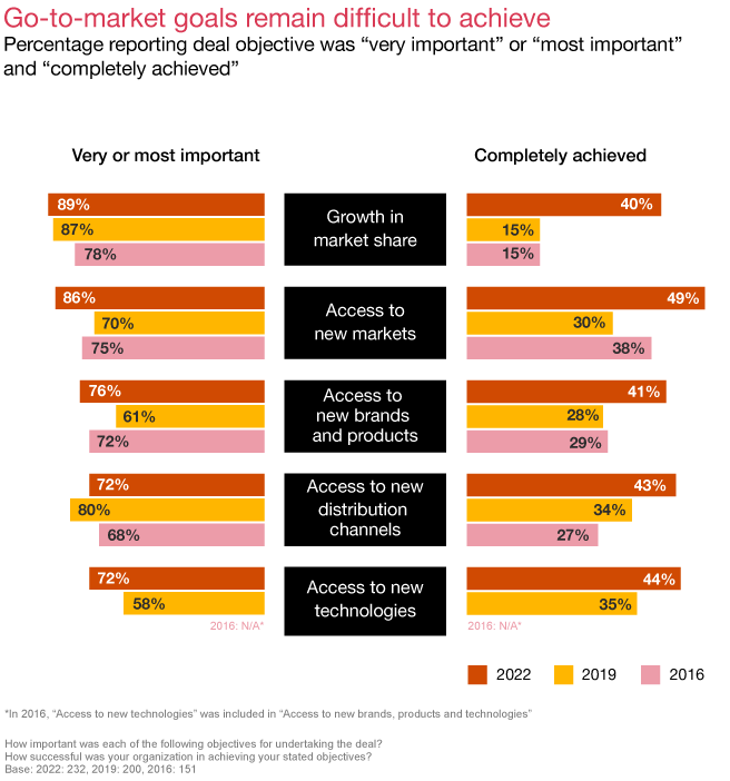 Similarly, remote working and different ways of working drove companies to focus on access to enabling technologies. Despite increasing importance, achieving go-to-market goals remains difficult, with less than half of respondents completely achieving these objectives. Successful M&A Organizations in the 2020-2022 survey period, however, were more than twice as effective in completely achieving go-to-market goals versus other respondents.