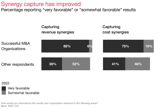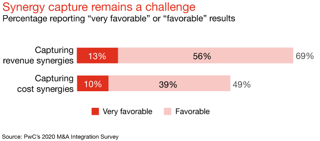 Despite missing some elements, respondents improved synergy capture as compared with our 2020 survey report. This reflects market expectations, the importance of experience and an increasing focus on execution.