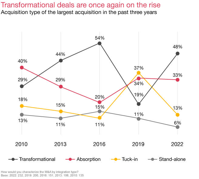 The expansionary policies of regulators and unprecedented geopolitical impact of COVID-19 shaped the size and type of transactions during the 2022 survey period — they are bigger, bolder and riskier. For the first time in our survey’s history, more than 25% of executives indicate that the purchase price of the acquired organization exceeded $5 billion. Transformational deals also increased significantly to nearly half of all deals.