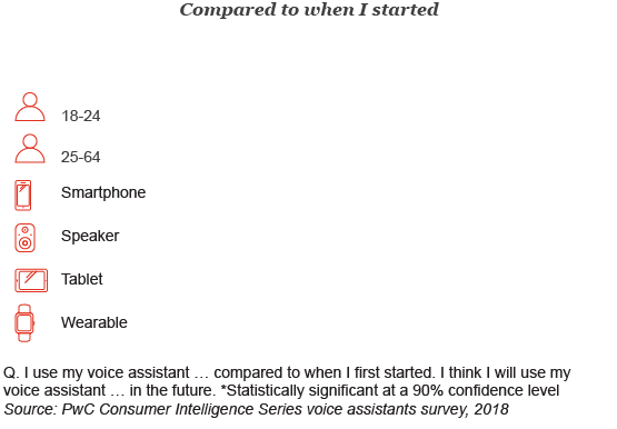 The average consumer is using their voice assistant more than they were before, and will use it even more in the future. Differences can be seen, however, among the youngest consumers we surveyed (18-24-year olds) and usage with smartphone voice assistants, with both groups exhibiting significantly less usage as time goes on.